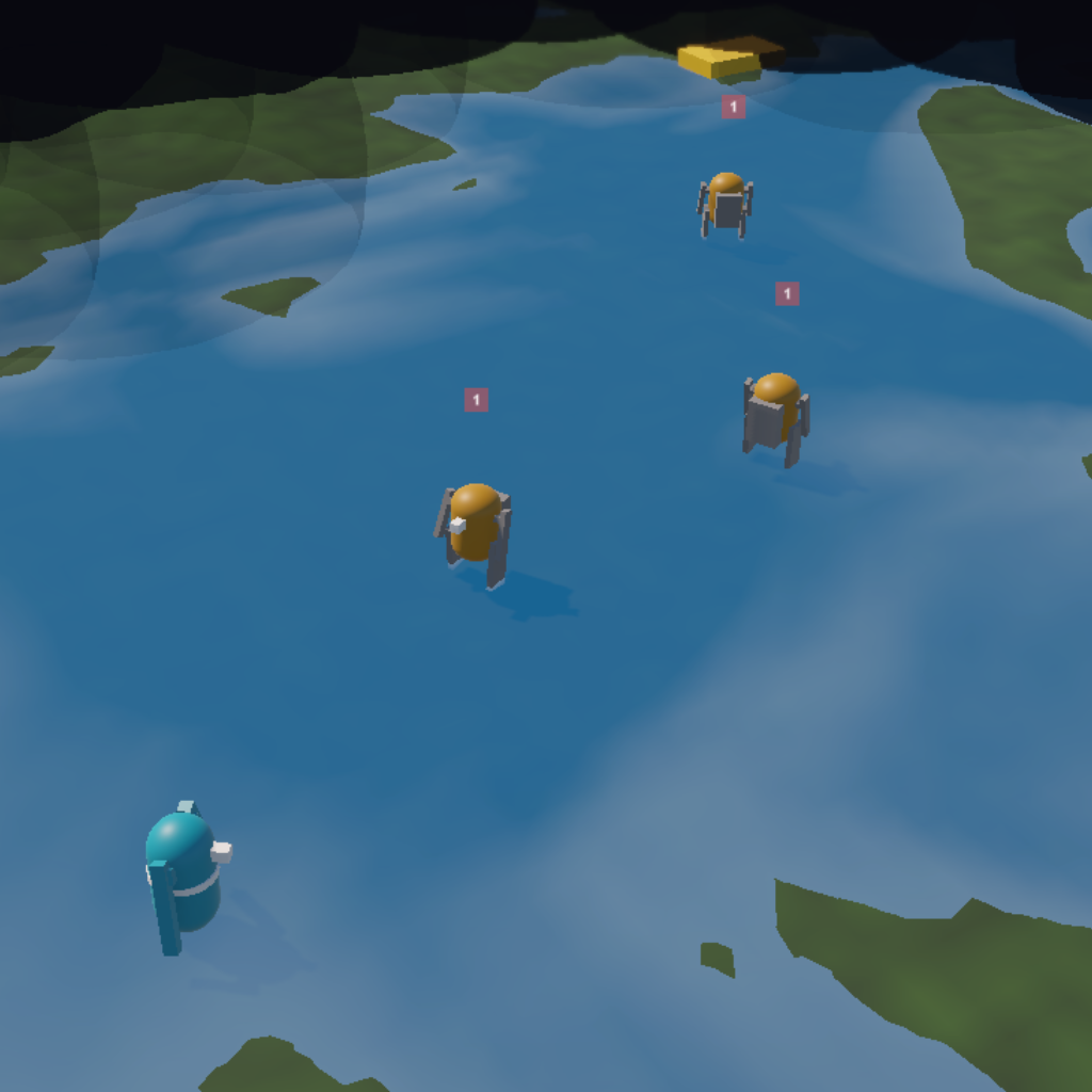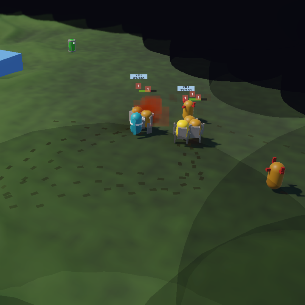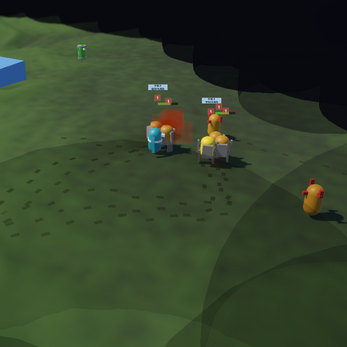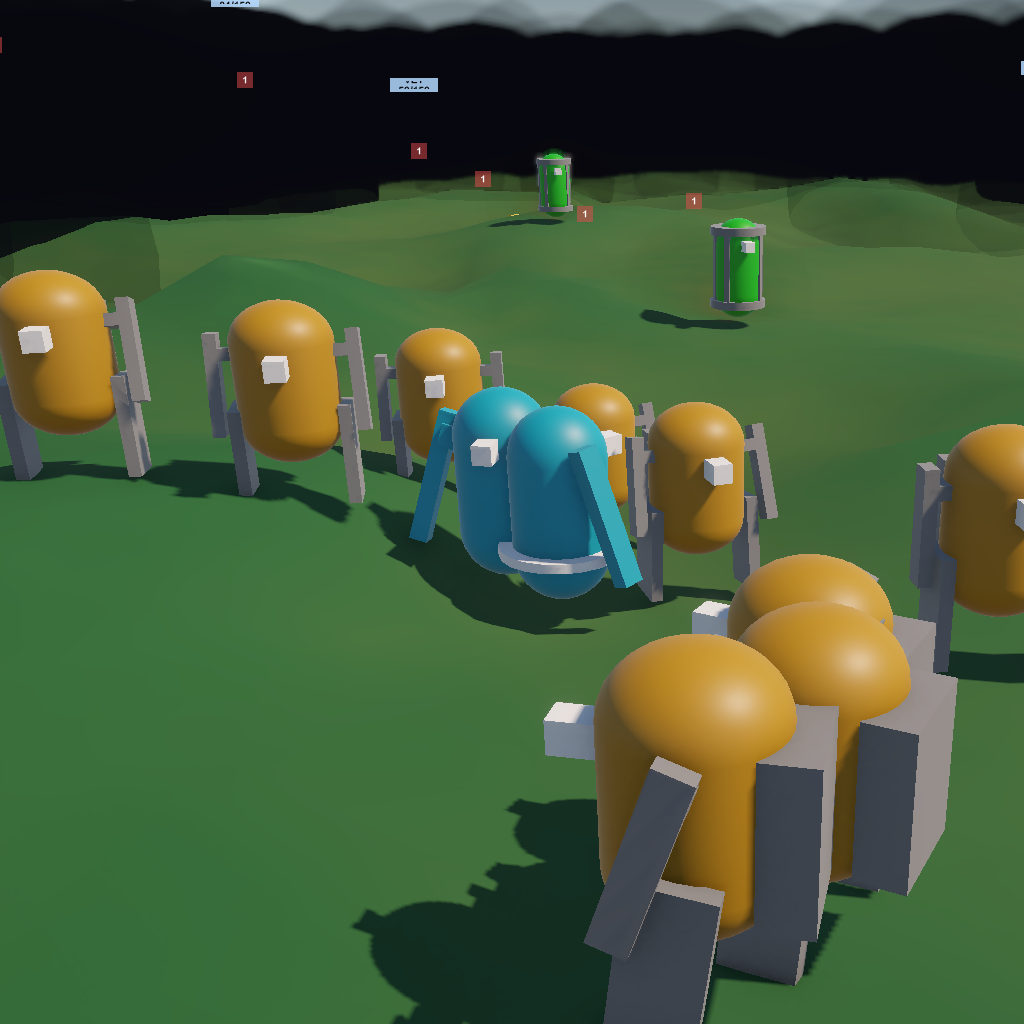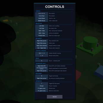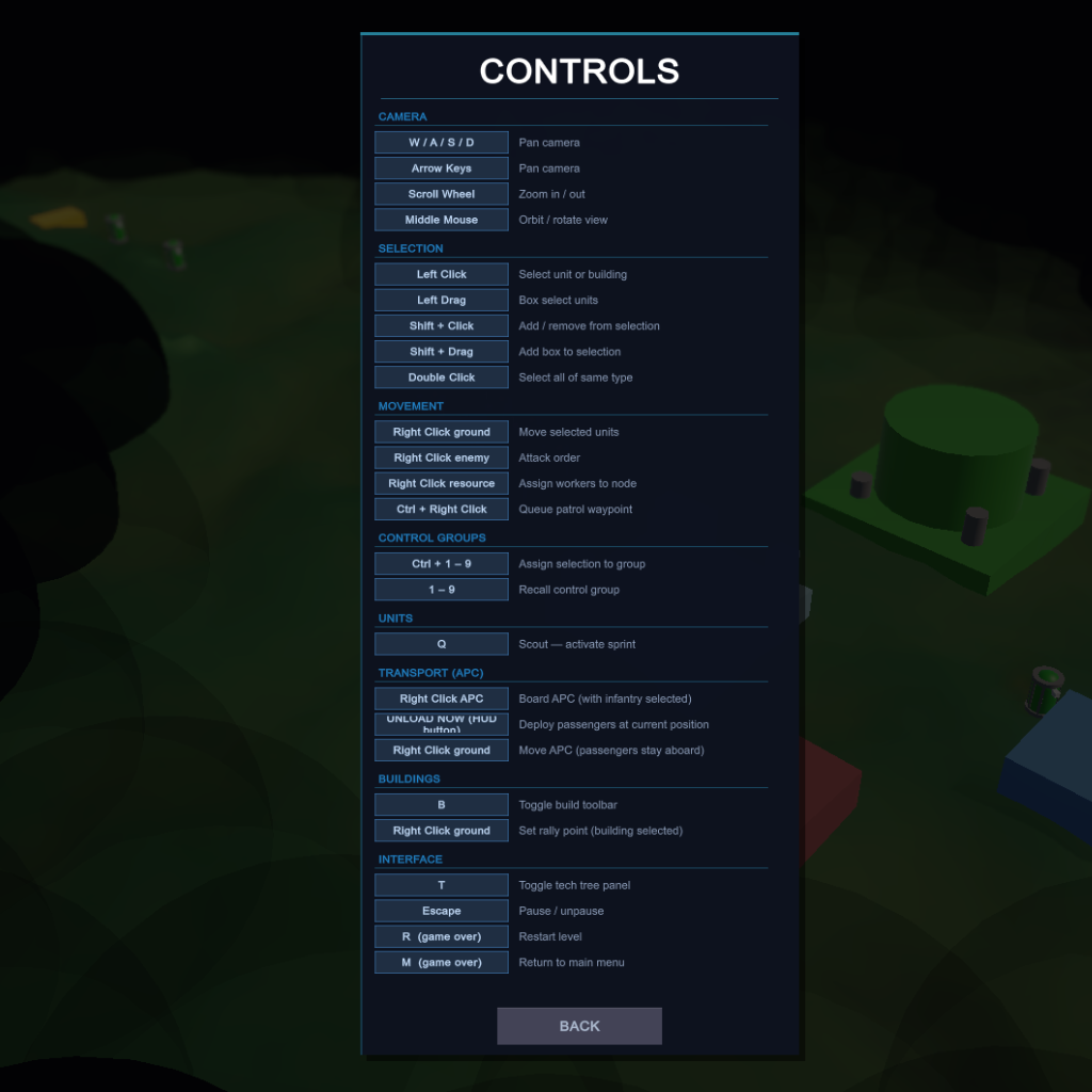 Train and command your forces. Field a range of units — from Workers and Scouts to combat troops and specialist Scientists — and direct them with full RTS controls including squad selection, shift-click additive selection, double-click type selection, control groups, patrol routes, and waypoint queuing. Units move and animate fluidly as a group.