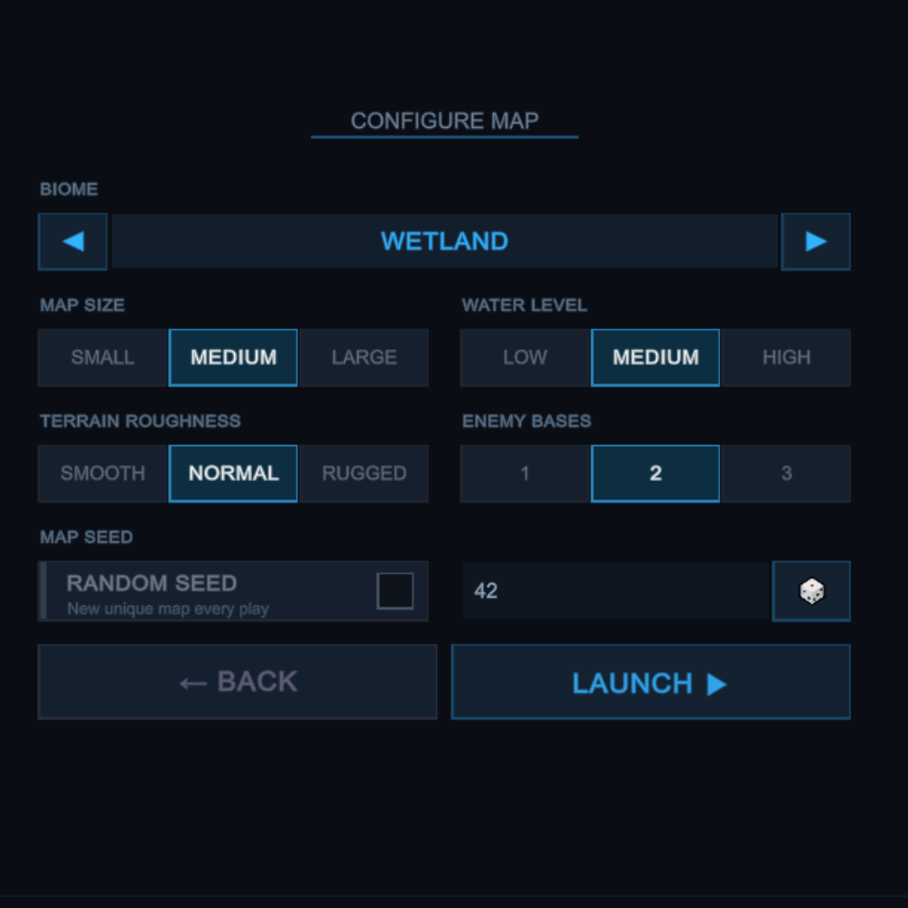 Every match drops you onto a freshly generated landscape — rolling grasslands, arid desert flats, waterlogged marshes, or jagged rocky terrain — with no two games playing out the same way. Customise your map before launch: choose your biome, adjust map size, water level, terrain roughness, and enemy base count, or roll a random seed and see what the world throws at you. Scout your surroundings, secure resource nodes, and expand your base before the enemy does.