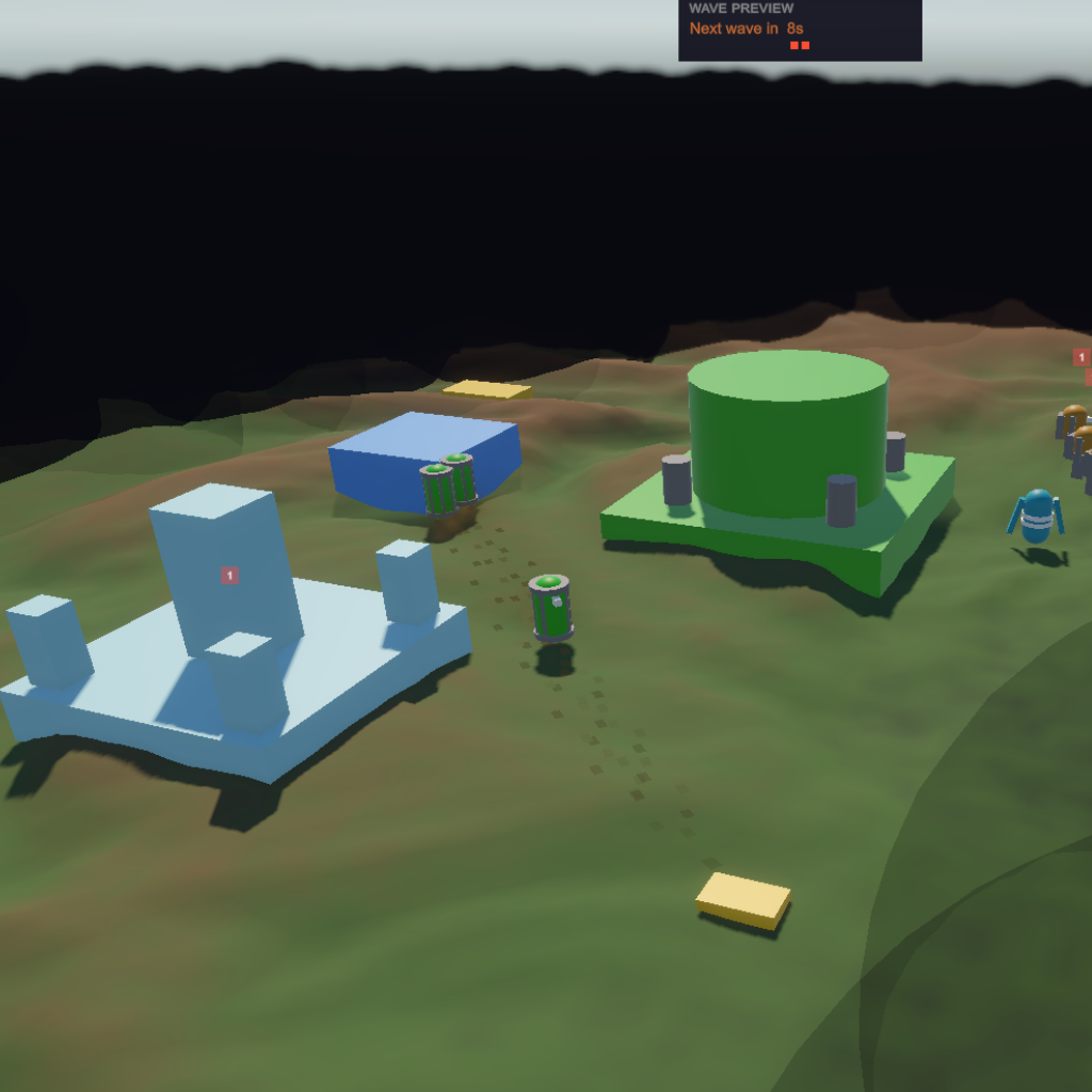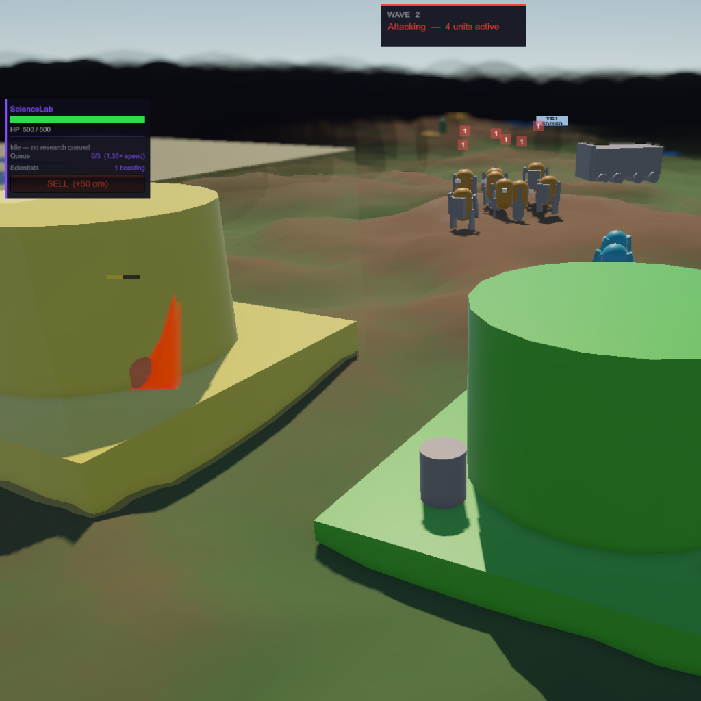 Build your base. Construct Barracks, Reactors, Resource Depots, and Research Labs. Upgrade your Command Structure to unlock new capabilities and fortify your position as the waves grow stronger. Buildings animate through construction and working states, giving your base a life of its own.